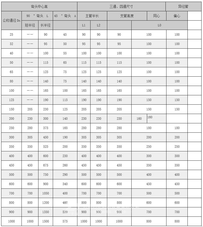 襯塑彎頭是采用與管材相同材質的板材用沖壓模具沖壓成半塊環形彎頭,然后將兩塊半環彎頭進行組對焊接成形。襯塑彎頭采用與鋼襯塑管道相同材質的襯里材料和相應尺寸,與管材配套使用,具有與管材相同的抗腐能力,具有互換性和通用性。鋼襯塑彎頭的規格如下: